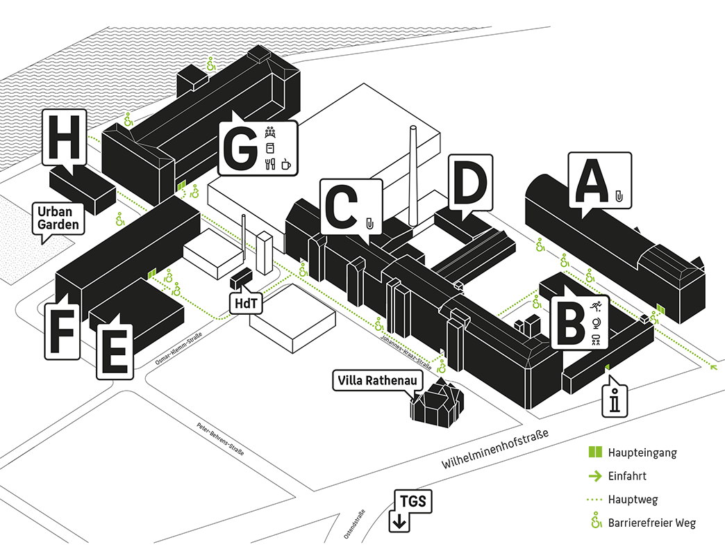 | Gebäude B | AStA, FSR, Lehrenden-Service-Center (LSC), Studienberatung & Career Service (ZSC), International Office, Hallen 1-4, Hochschulsport (Halle 4) |